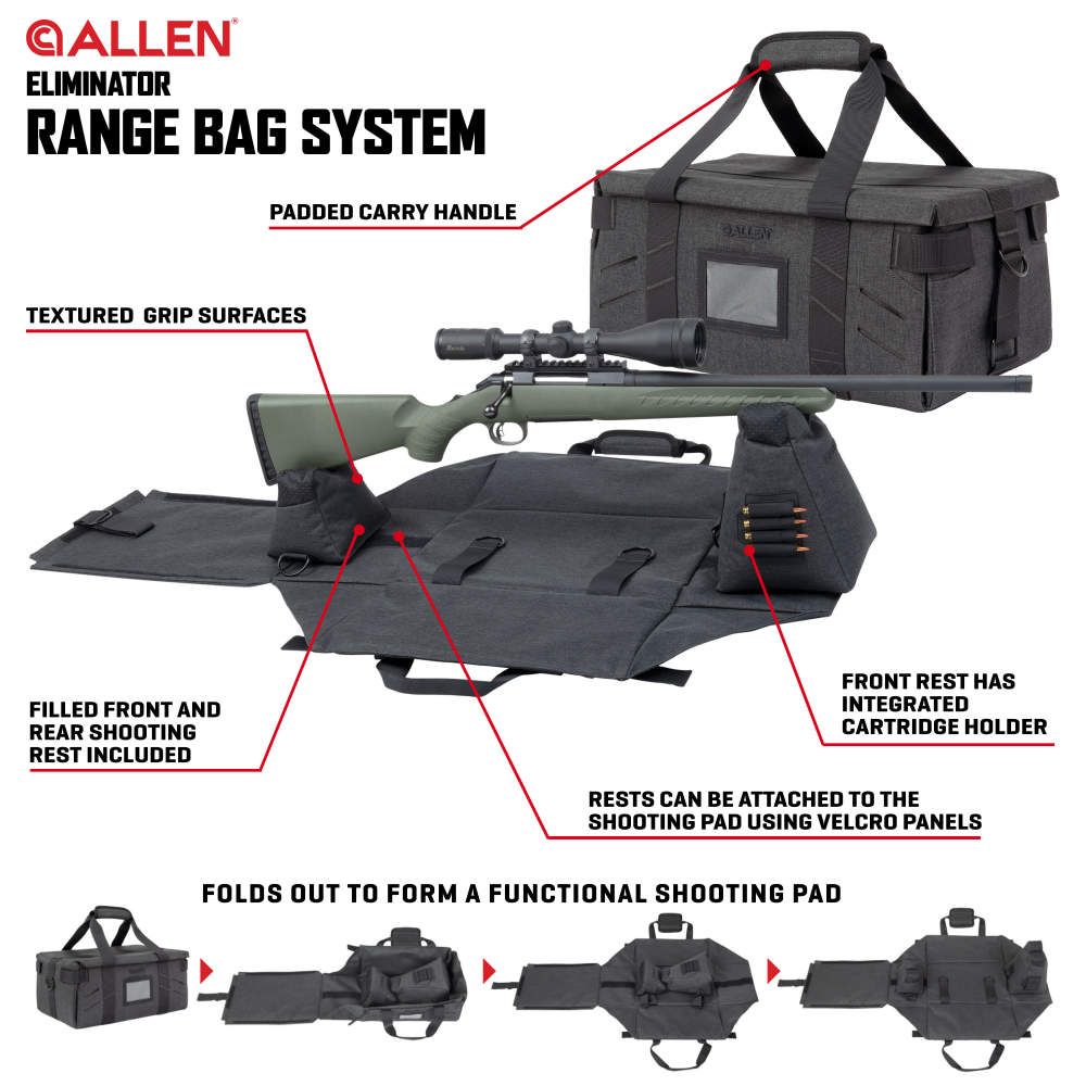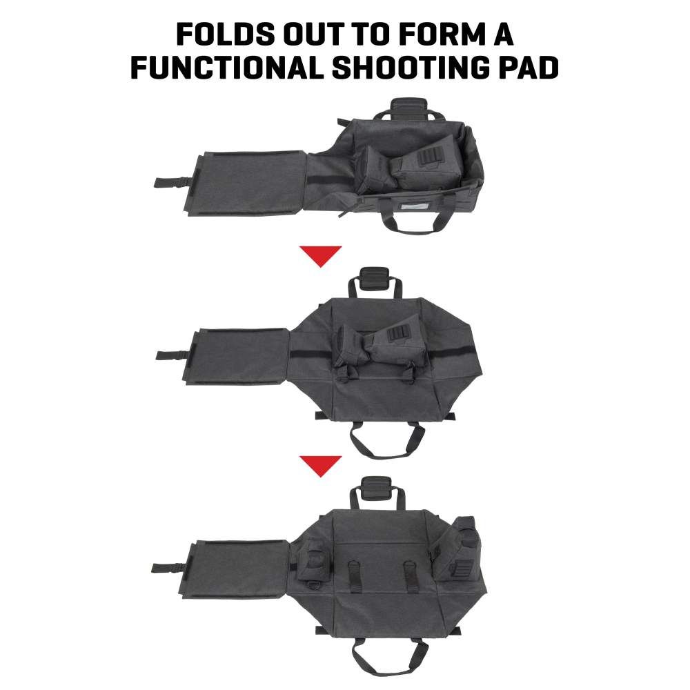 Eliminator Range Bag & Portable Shooting System pruža vam sve-u-jednom, torbu za koja se lako nosi, oslonac za oružje i podstavljenu platformu za gađanje.
