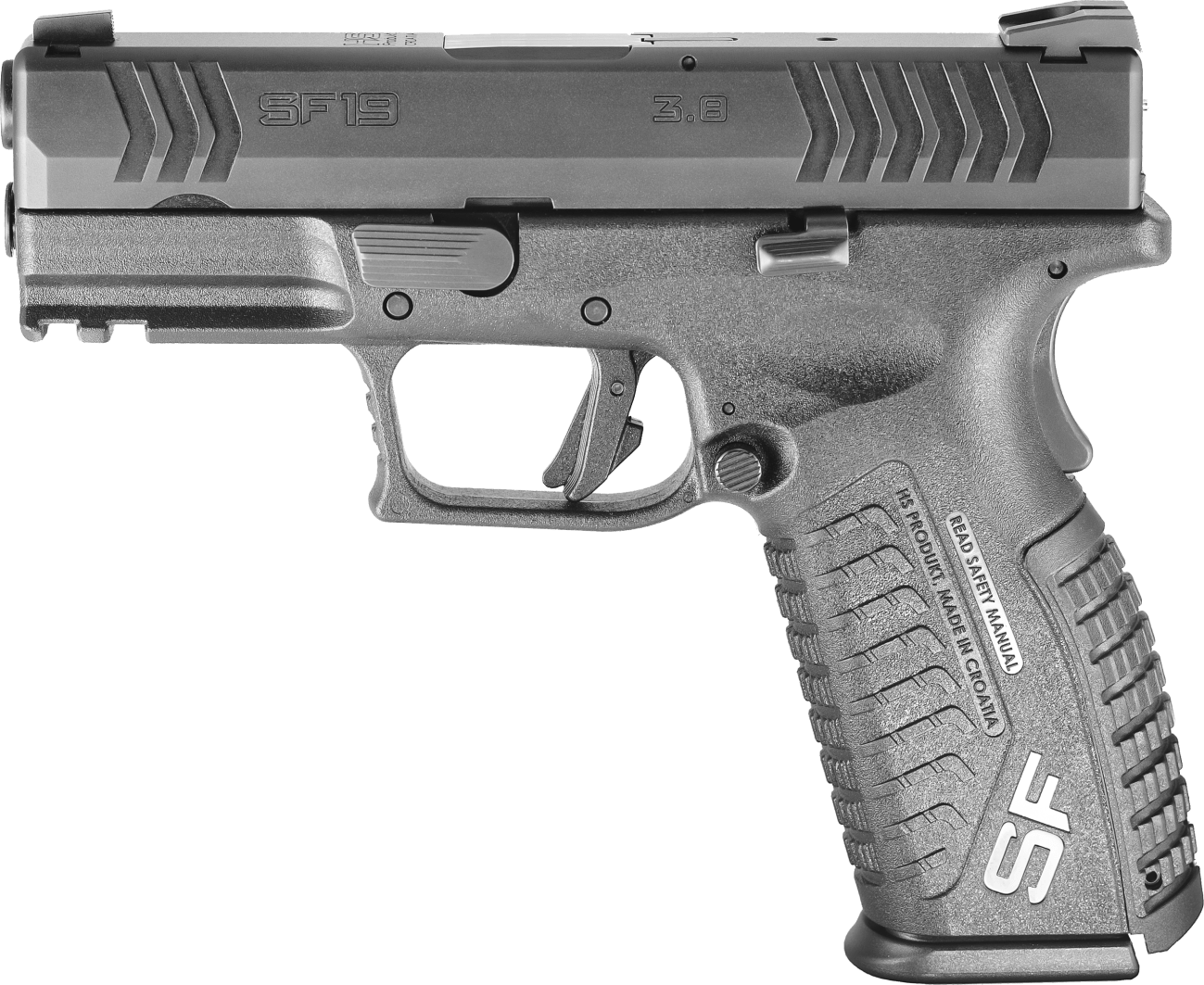 SF19 3.8 sadrži sve što znamo i volimo u modelu pune veličine; potpuno ambideksterna poluga za zaustavljanje navlake i prihvat spremnika, tri sigurnosna sustava – sigurnost udarne igle, sigurnost prianjanja i sigurnost okidača s dva pokazatelja – striker status i indikator opterećene komore (vizualnim i taktilnim).