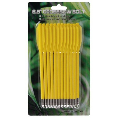 12 komada plastičnih strijela u žutoj boji, u pakiranju sa čeličnim vrhom, namijenjene za korištenje sa pištoljskim samostrelima.